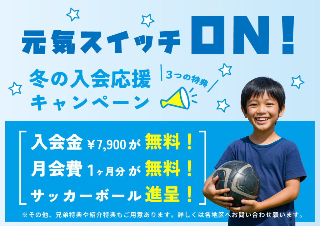 新規入会キャンペーン実施中! 2026.02.02 JSNサッカークラブでは、新規ご入会キャンペーン実施中! 当クラブのホームページから、2/1(日) 〜 2/28(土)にお申し込みをいただいた方を対象にプレゼントキャンペーンを実施しております。 【3つの特典内容】 ①入会金無料 ②1ヶ月分会費無料 ③サッカーボールプレゼント ※その他、兄弟特典や紹介特典もご用意あります。詳しくは各地区へお問い合わせ願います。 当クラブは2歳のお子さまから小学6年生までのお子さまが対象で、初心者でも安心して通えるサッカークラブになっております。 お気軽にお問い合わせや無料体験のお申込みをお待ちしております。 ※その他、対象地区によって特典内容が変わります。お問い合わせ時にご確認ください。 ※人数に限りがございますのでご了承ください。 ※全国に到達し次第終了とさせていただきます。 JSNサッカークラブ事務局